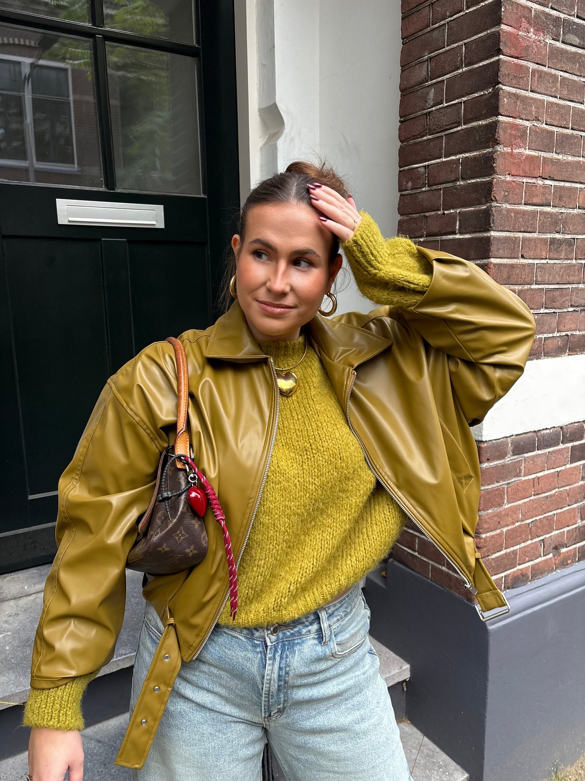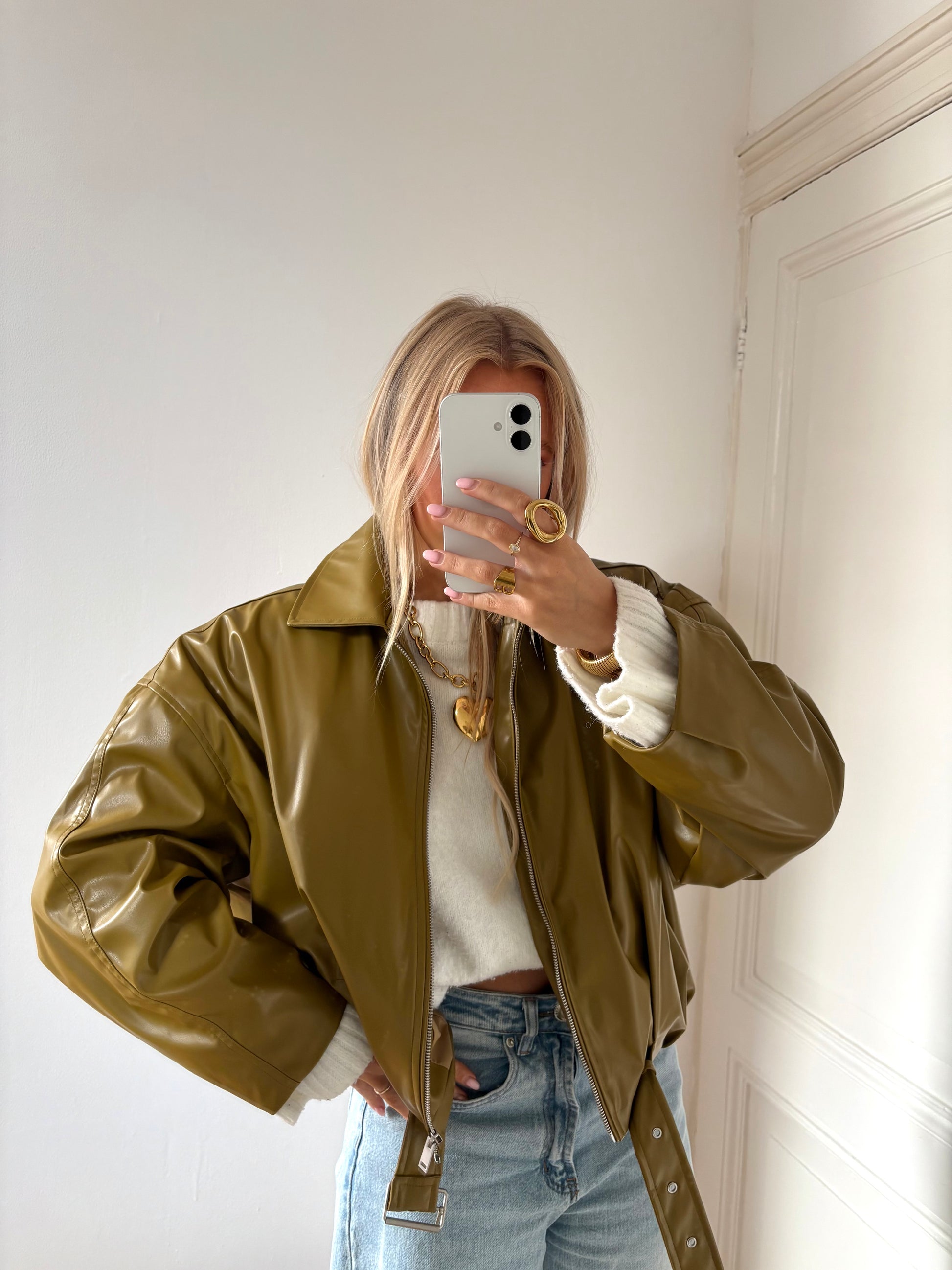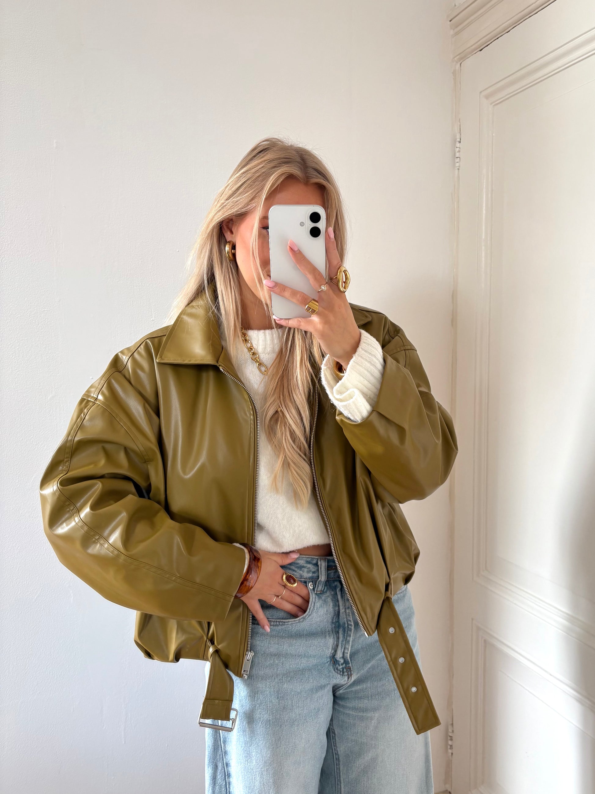- Details: oversized bomber, pu leder, zilveren hardware, bevat zakken, bevat een ritssluiting