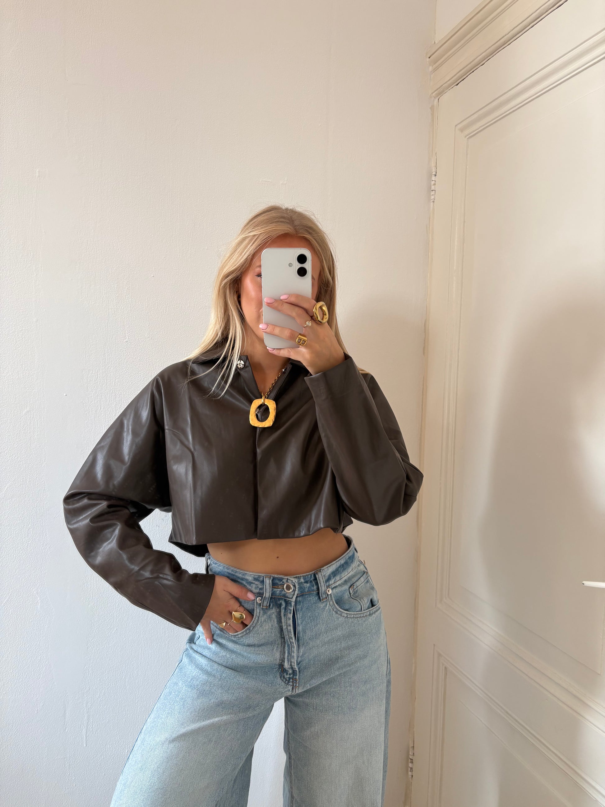 - Details: PU leder, oversized fit, knoopsluiting, zilveren drukknoopjes, cropped model