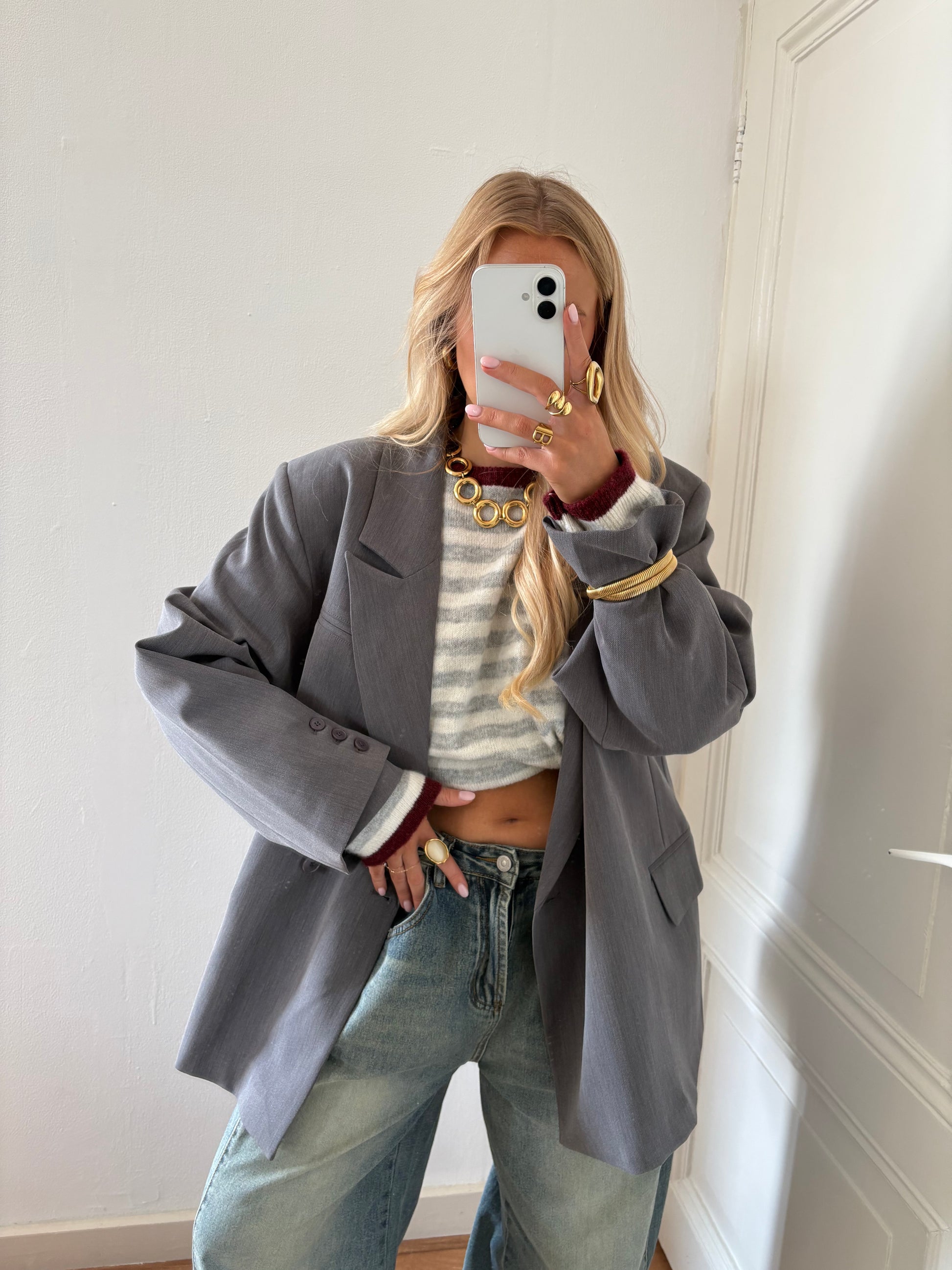 - Details: wit met grijs gestreept, bordeaux bij hals en mouwen, oversized fit, ronde hals