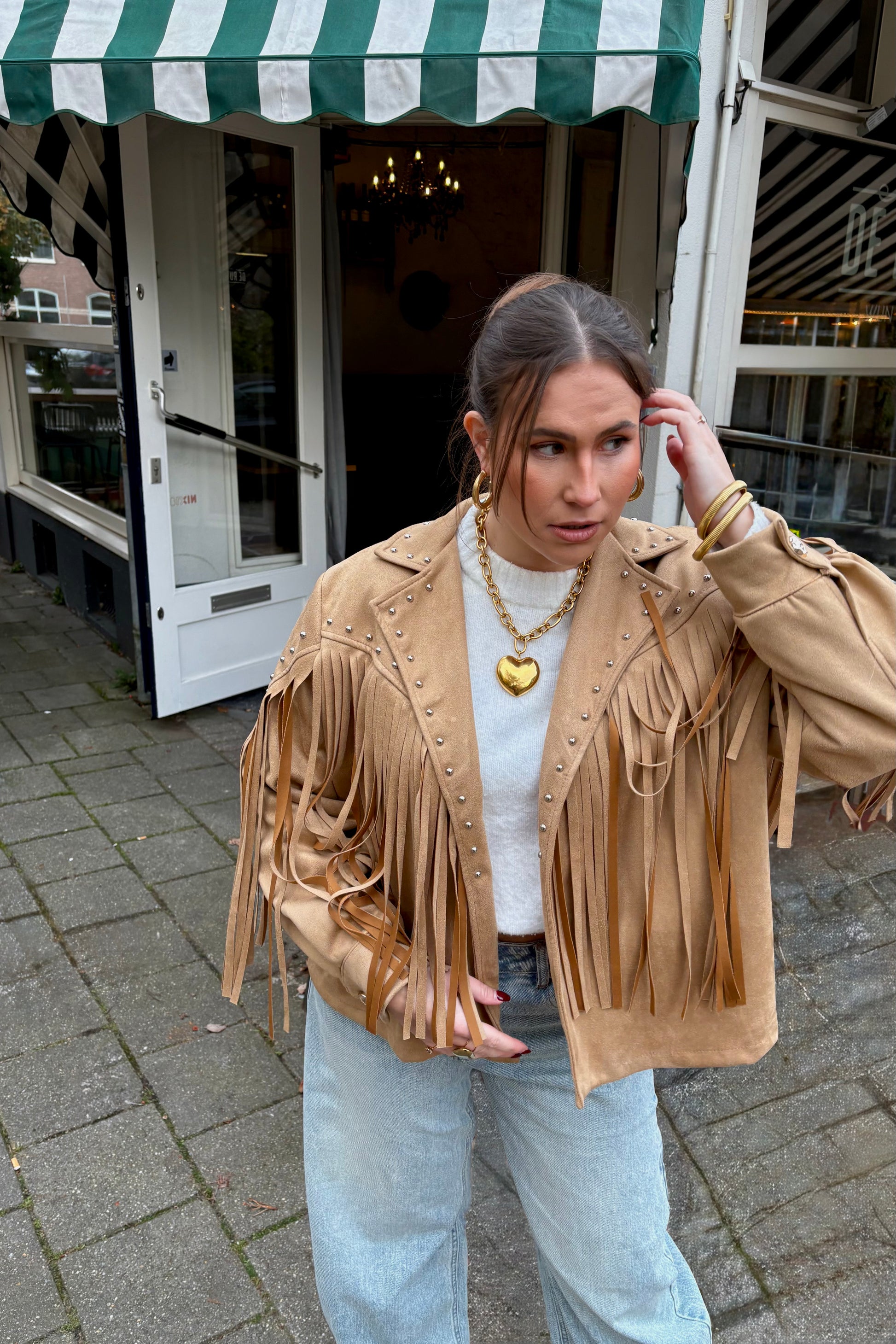 - Details: oversized fit, camel kleur, zilveren studs, niet gevoerd, suedelook, bevat geen zakken, bevat geen sluiting